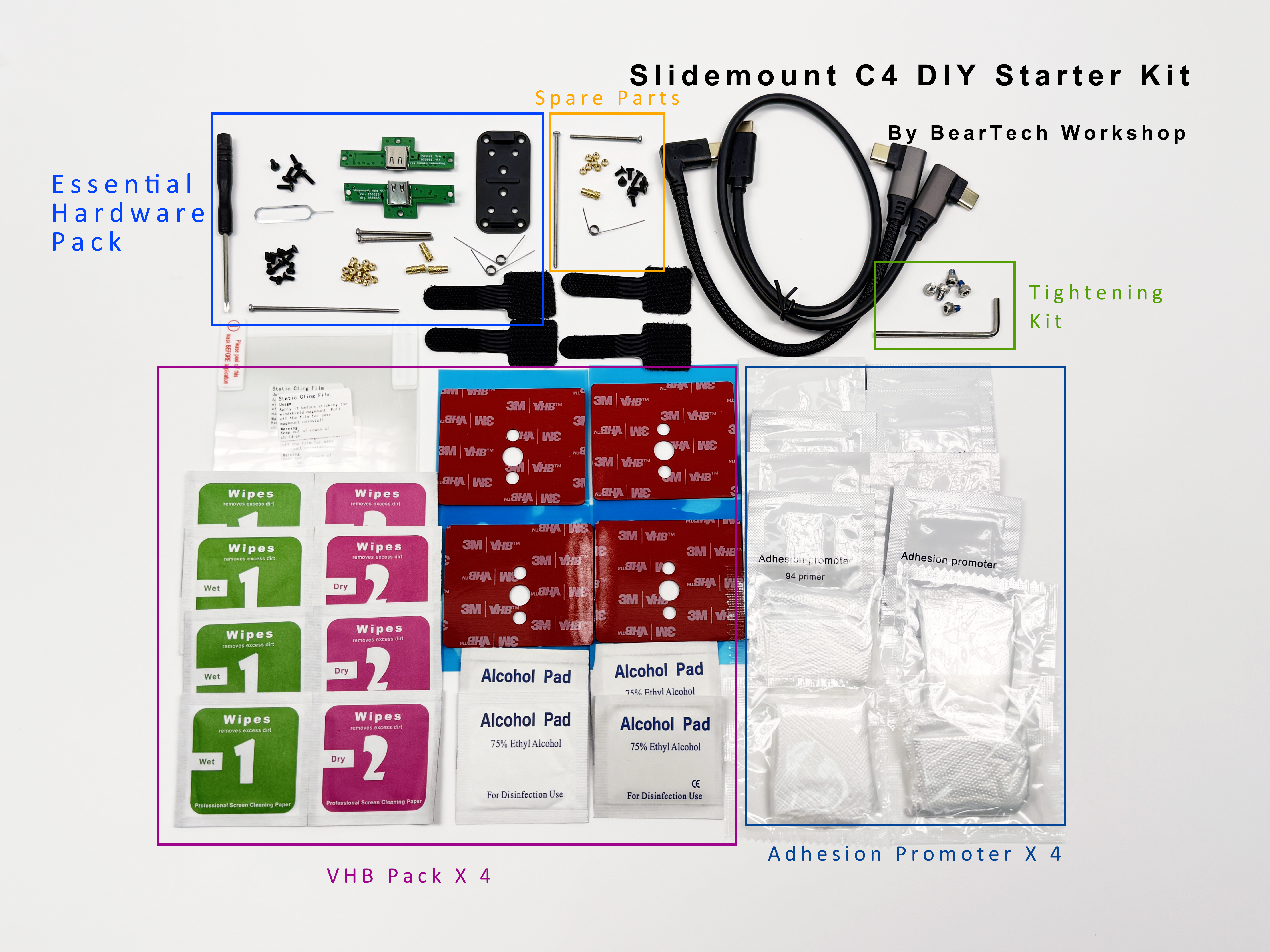 The SlideMount C4 DIY Starter Kit includes everything you need to assemble and install your custom mount, meticulously organized to make your build as smooth as possible. Inside the package, you will find: